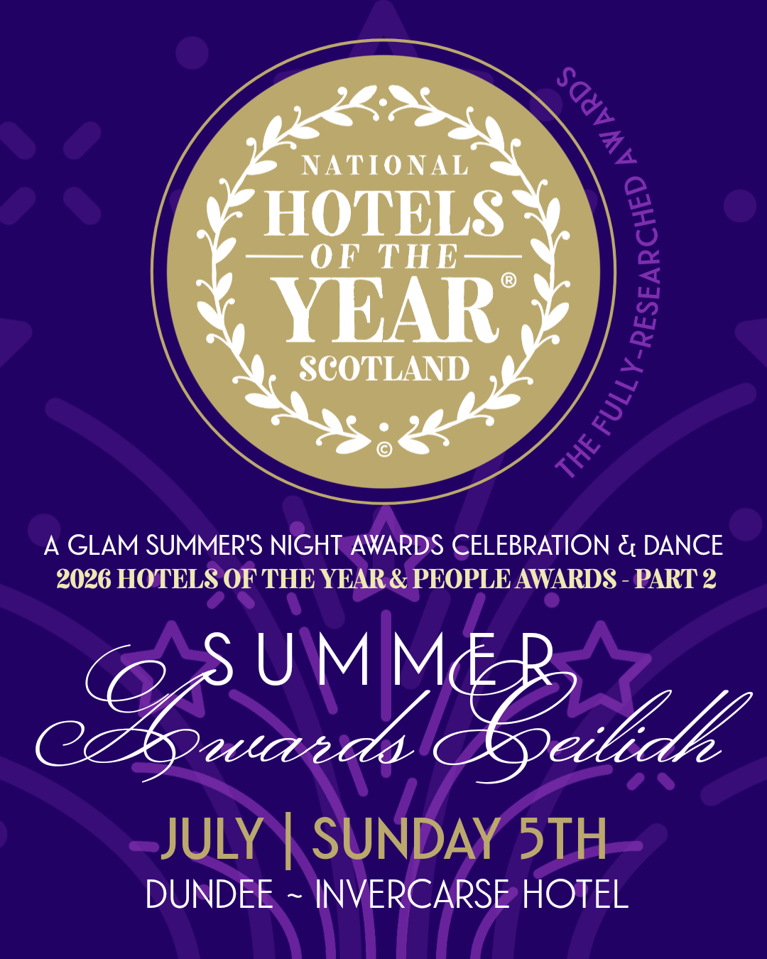 Summer Awards Ceilidh celebration in a fab ballroom overlooking the silvery Tay in Dundee - at the Banqueting Hotel of the Year 2025, no less - as we present Part 2 of the awards. Event & Category details soon.
